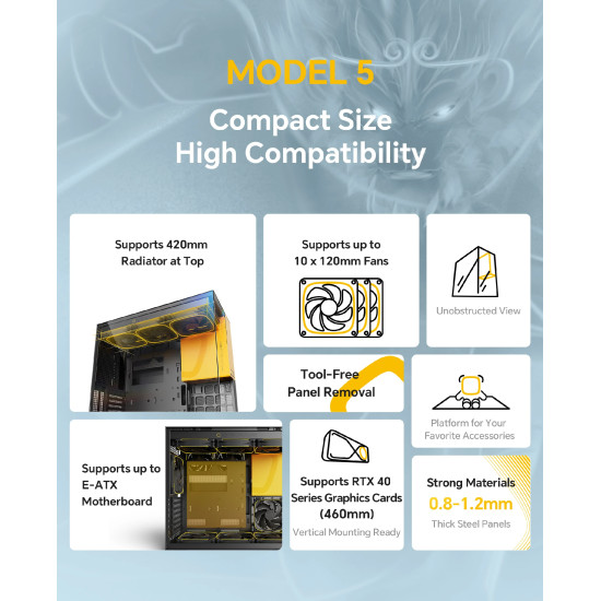 | ДОПЪЛНИТЕЛНИ | Supports 420mm radiator , E-ATX and 460mm GPUs Supports up to10 x 120mm fans 0.8-1.2mm thick steel for entire chassis Unique location for the PSU Fun yet functional built-in display platform Dual tempered glass panel |